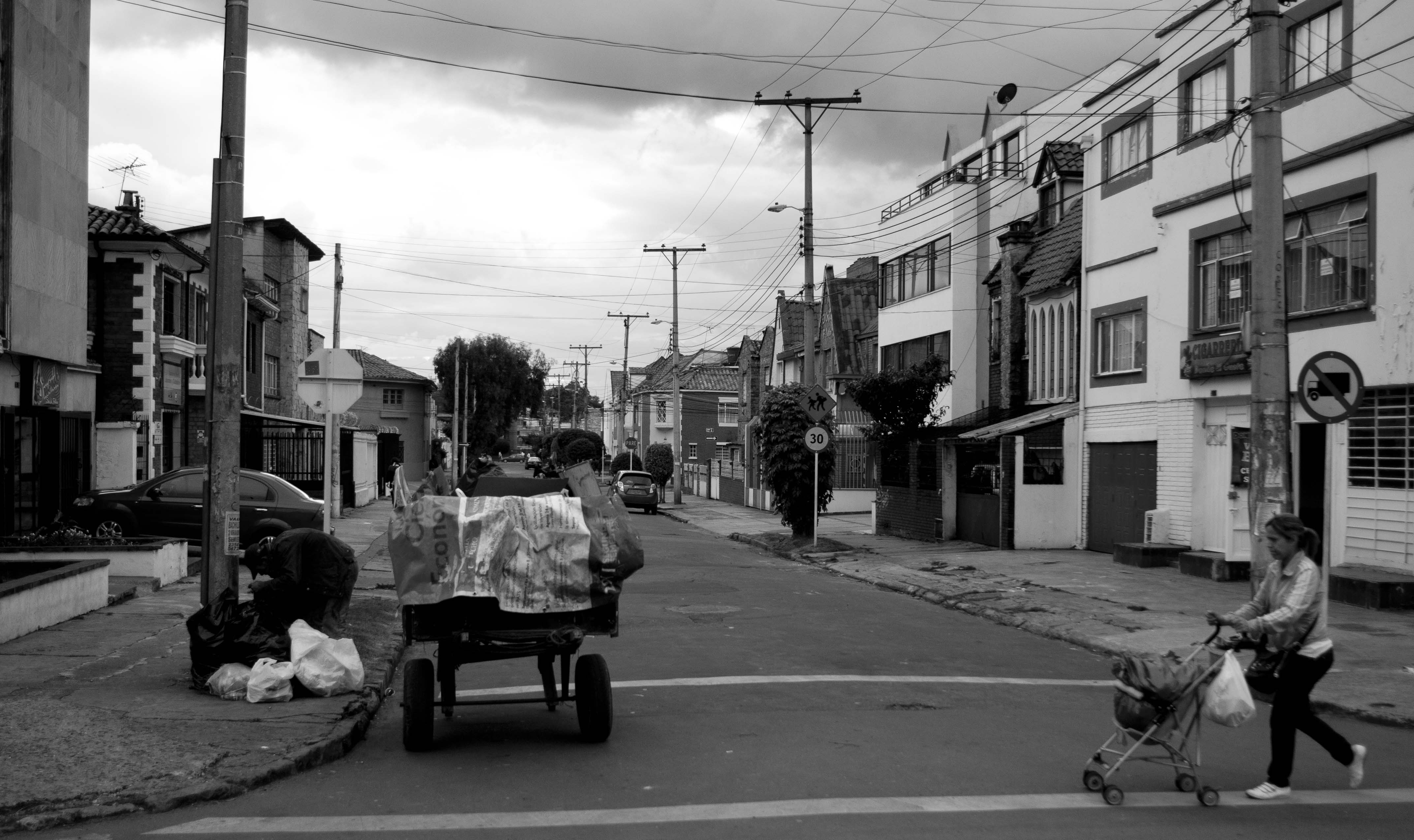 Inside the cart there is a mess of used appliances, black bags concealing used auto parts, pieces of wood, plastic, beer bottles, and coils of wire coated in rust. The cart is stopped on the side of Avenida Caracas, one of Bogotá’s main commercial avenues. It’s raining. Tied up and wet, a dog jumps out of the cart and onto one of the planks of wood. Tugging against the weight of the cart, the dog points its head toward the sky and howls.