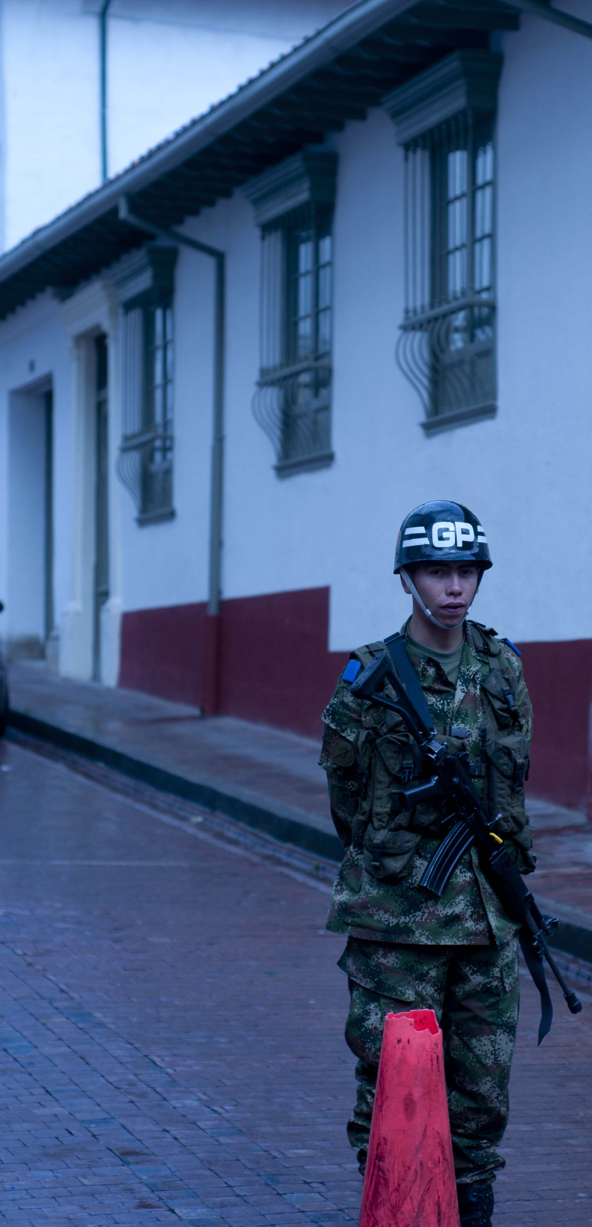 When I got to the Ministry buildings, there were soldiers with automatic rifles stationed on the corners. I walked down a cobblestone street. The Presidential office Casa Nariño spread out in front of me. More soldiers, this time with bayonets pointing up into the sky at a sharp angle, marched in formation about the green on the other side of a tall gate. At the Ministry of Finance, I registered. They took a photograph of me. And then the elevator took me up.